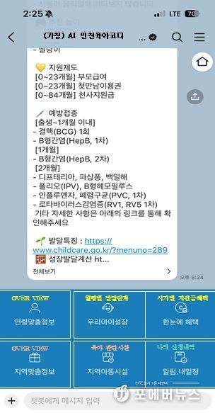 ‘AI 인천육아코디’는 단계적으로 인공지능(AI)과 자동화 프로그램을 연동해 부모의 질문에 개인화된 정보를 안내하고, 향후 일정 알림 서비스 등 기능을 확대해 나갈 예정이다.