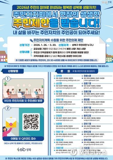 성북구 관계자는 “20~40대 세대의 참신한 아이디어부터 어르신들의 지혜까지 전 세대의 목소리를 담는 과정이 곧 성북형 주민자치의 핵심 동력”이라며, “주민이 동네 변화의 주체가 되어 직접 결정하고 실천하는 주민자치계획에 생생한 현장의 목소리가 반영될 수 있도록 많은 참여와 관심을 부탁드린다”고 전했다.