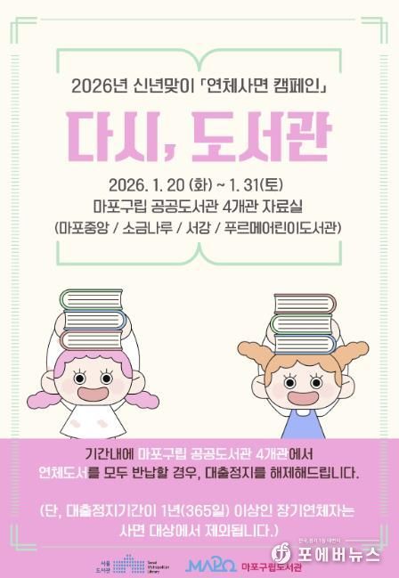 [ 포에버뉴스 김경순 기자 ] 마포구는 2026년 새해를 맞아 도서 연체로 도서관 이용이 제한된 구민이 다시 도서관을 이용할 수 있도록 돕고, 일상 속 독서 참여를 확대하기 위해 연체사면 캠페인 '다시, 도서관'을 운영한다.