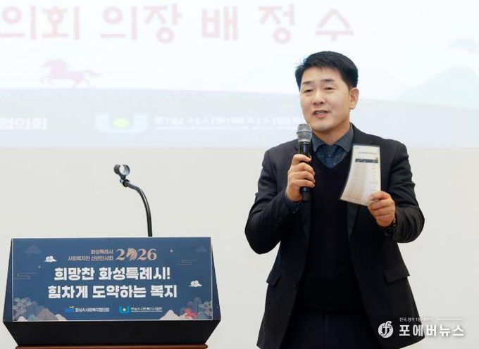[ 포에버뉴스 김경순 기자 ] 화성특례시의회는 26일 호텔 푸르미르 그랜드볼룸에서 열린 '2026년 화성시사회복지협의회·사회복지사협회 신년인사회'에 참석해, 병오년 새해를 맞아 사회복지 종사자들과 함께 희망과 연대의 뜻을 나눴다.