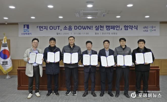 수원시 권선구는 지난 1월 27일 구청 상황실에서 관내 대형공사장 6개소와 비산먼지 및 소음 저감을 위한 ‘먼지 OUT, 소음 DOWN! 실천 캠페인’ 자율 실천 협약식을 개최했다.