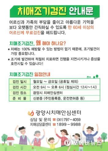 이에 광양시치매안심센터는 특별한 증상이 없더라도 60세 이상 어르신의 경우 연 1회 정기적인 치매 조기검진을 받을 것을 권장하고 있다.