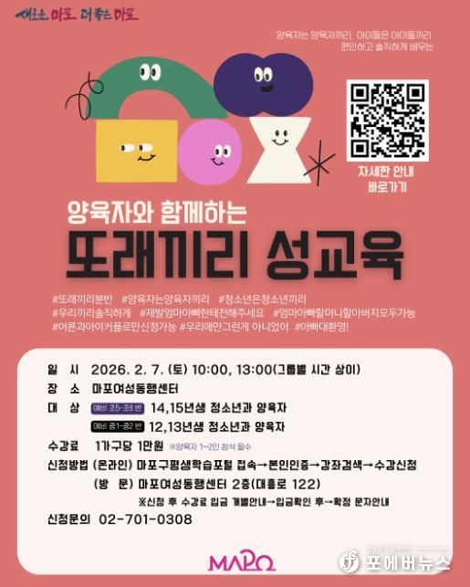 [ 포에버뉴스 김경순 기자 ] 마포구는 부모와 청소년 자녀가 함께 참여하는 ‘양육자와 함께하는 또래끼리 성교육’을 운영한다.