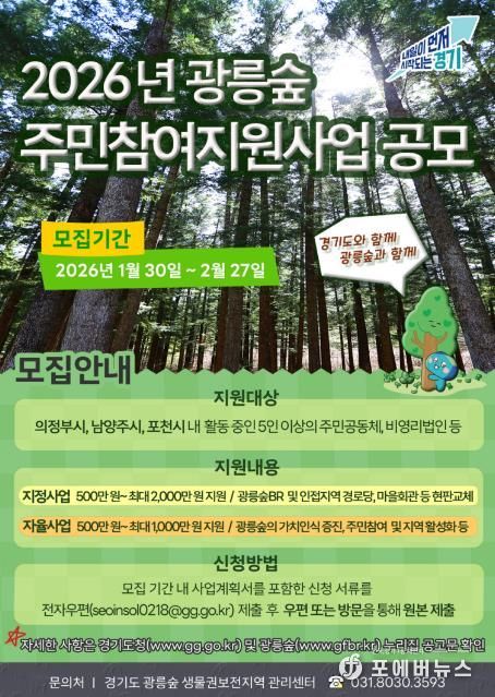 [ 포에버뉴스 김경순 기자 ] 경기도가 광릉숲 생물권보전지역 활성화를 위해 2026년 광릉숲 주민참여지원사업 참여자를 모집한다.