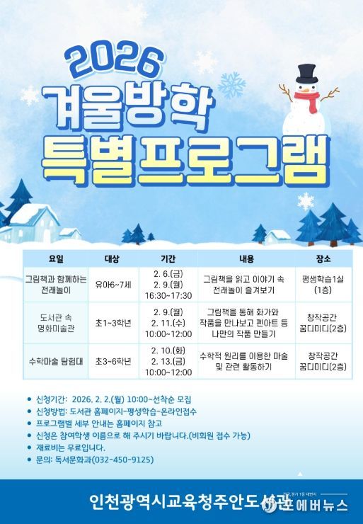 [ 포에버뉴스 김경순 기자 ] 인천광역시교육청주안도서관은 관내 유·초등학생에게 다양한 평생학습 기회를 제공하기 위해 2월 6일부터 13일까지 ‘겨울방학 특별프로그램’을 운영한다.