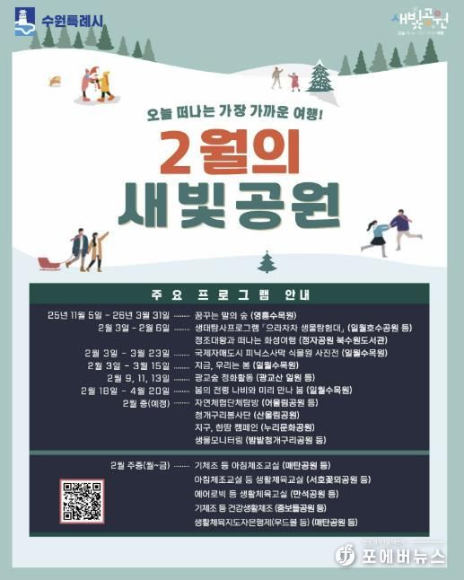 [ 포에버뉴스 김경순 기자 ] 수원특례시가 2월 한 달간 가까운 공원에서 즐길 수 있는 생태·환경·생활체육 프로그램을 운영한다.