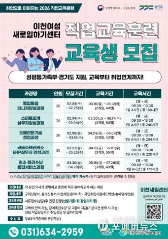 [ 포에버뉴스 박정배 기자 ] 이천여성새로일하기센터는 경력 단절 여성의 직업능력 개발과 취·창업 연계를 위해 2026년 직업교육훈련 교육생을 모집한다.