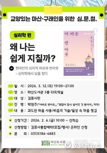 [ 포에버뉴스 김경순 기자 ] 김포시 마산도서관은 심리적 피로와 번아웃을 주제로 한 인문교양 강연 '왜 나는 쉽게 지칠까?'를 오는 3월 12일 오후 7시부터 9시까지 마산도서관 3층 다목적실에서 운영한다.