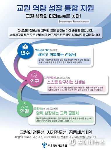 ‘교원 성장의 다리(Da:RI, Development and Research Integration)’는 연수(배우고 회복하는 선생님), 연구(스스로 탐구하는 선생님), 연결(함께 성장하는 교육공동체)의 통합 지원 체계 구축을 상징하며, 서울교육의 현재와 미래를 연결하는 다리(Bridge)를 의미한다. 구체적인 내용은 다음과 같다.