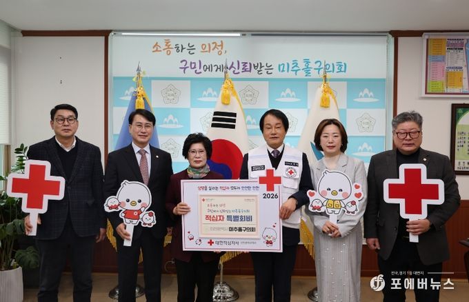[ 포에버뉴스 김경순 기자 ] 인천광역시 미추홀구의회는 2월 4일 의회 의장실에서 전경애 의장과 장규철 부의장을 비롯한 상임위원장들과 조의영 대한적십자사 인천지사 회장 및 조혜정 적십자봉사회 미추홀지구협의회 회장과 관계 임원들이 참석한 가운데 2026년도 적십자 특별회비 전달식을 개최했다.