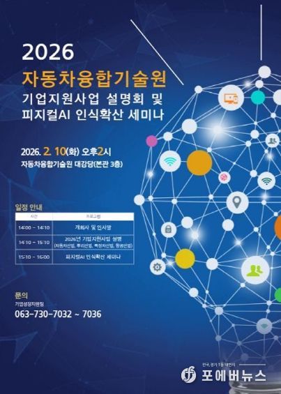 [ 포에버뉴스 사공선 기자 ] 전북특별자치도는 도내 자동차·뿌리·특장·항공산업 등 주력산업의 경쟁력 강화를 위해 오는 10일 자동차융합기술원에서 ‘2026년 기업지원사업 설명회 및 피지컬AI 산업 인식확산 세미나’를 개최한다고 5일 밝혔다.