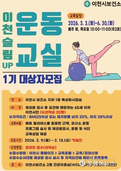 신청은 2월 9일부터 2월 13일까지 이천시 누리집(홈페이지) 교육포털 시스템을 통해 가능하며, 선착순 접수 순서대로 보건소 체성분 검사 실시 및 자격요건 충족 시 최종 등록된다.