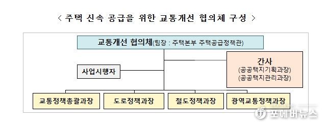 협의체는 주택공급추진본부 주택공급정책관을 팀장으로 교통정책총괄과장, 도로정책과장, 철도정책과장, 광역교통정책과장으로 구성되며, 주택공급 대상지와 관련하여 도로·철도·대중교통 등 교통 전반에 관련한 개선방안을 종합적으로 검토할 계획이다.