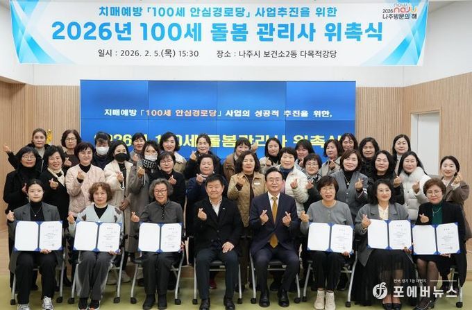 나주시는 올해 1월 공개 모집을 통해 노인 돌봄과 복지 관련 자격을 갖춘 총 40명(재위촉 33명, 신규 7명)의 ‘100세 돌봄관리사’를 선발하고 지난 5일 나주시보건소 다목적 강당에서 위촉식을 개최했다고 6일 밝혔다.
