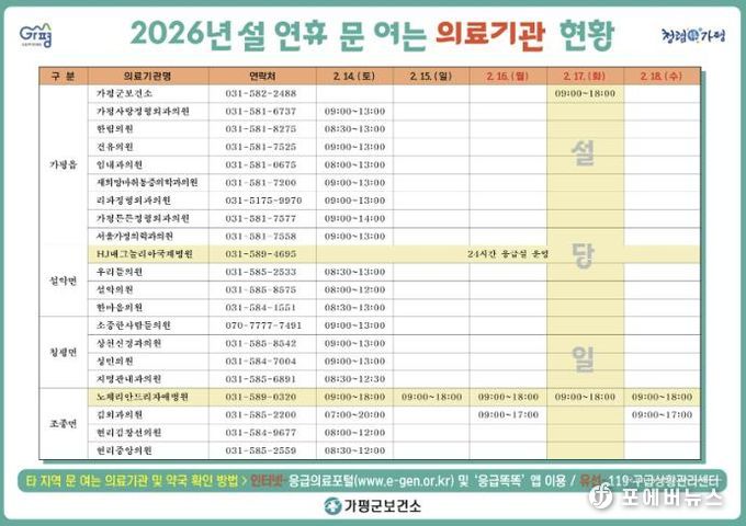 아울러 가평군은 설 연휴 동안 운영하는 의료기관, 약국 정보를 사전에 안내하고 있다. 연휴 기간 문을 여는 의료기관 및 약국 정보는 △가평군청 및 가평군보건소 홈페이지 △119구급상황관리센터 △응급의료포털 △보건복지콜센터에서 확인할 수 있다.