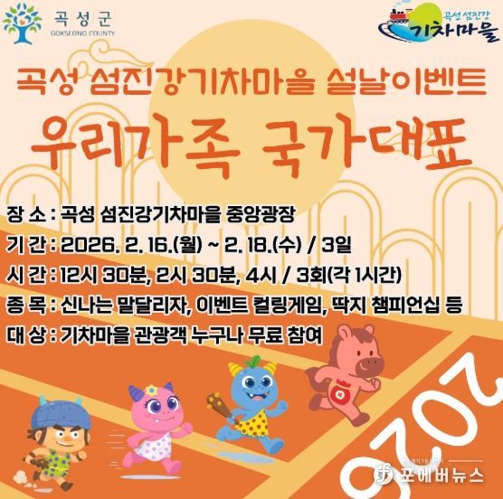 [ 포에버뉴스 오명숙 기자 ] 곡성군은 설명절 연휴 기간 중 2월 16일부터 18일까지 3일간 섬진강기차마을 중앙광장에서 방문객들을 위한 특별 이벤트를 운영한다고 6일 밝혔다.