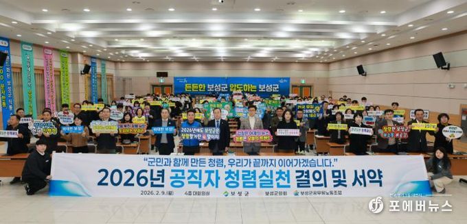 [ 포에버뉴스 오명숙 기자 ] 보성군은 지난 9일 보성군청 대회의실에서 보성군, 보성군의회, 보성군공무원노동조합이 공동 참여한 ‘2026년 반부패·청렴 실천 결의 및 서약식’을 개최했다고 밝혔다.