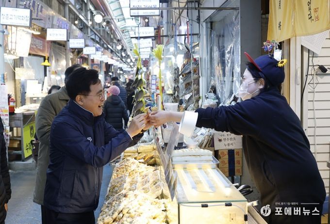 시장 곳곳의 점포를 방문해 한과, 딸기, 떡 등을 온누리상품권으로 구매하며 장바구니 체감 물가도 살폈다.