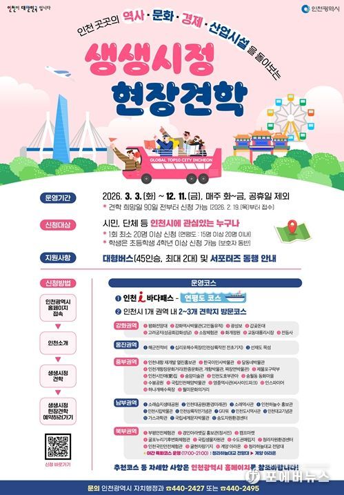 [ 포에버뉴스 김경순 기자 ] 인천광역시가 인천의 주요 사업 현장과 문화·환경 시설을 직접 방문하는 ‘2026년 생생시정 현장견학’을 오는 3월 3일부터 본격 시작한다.