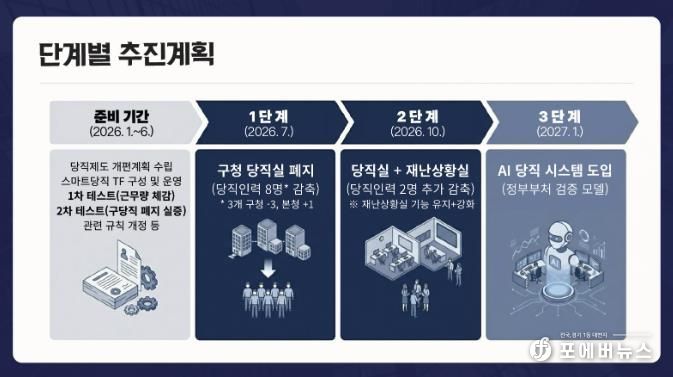 시는 올해 상반기를 사전 준비 기간으로 정하고, 8개 부서가 참여하는 AI 당직 전담조직(TF)을 구성하고 시·구청 당직 통합 시 근무량을 검증했다. 다음 달에는 구청 당직 폐지 시 예상되는 시민 불편과 사각지대를 시뮬레이션 방식으로 점검하고, 5월까지 조례·규칙 개정과 법제 심사를 마쳐 제도적 기반을 마련할 예정이다.