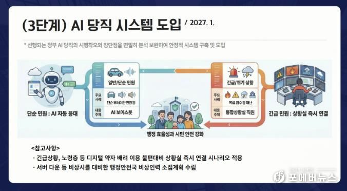 내년 1월부터는 3단계 ‘AI 당직 시스템’을 본격 가동한다. 야간시간 처리가 불가능한 단순 부서 이관 민원 등은 AI 보이스봇이 24시간 자동 접수하고, 긴급 상황·복합 민원은 즉시 통합상황실로 자동 연동되는 AI-인간(Human) 협업 방식이다. 노령층 등 디지털 약자를 위한 즉시 연결 서비스와 장애 대비 비상 인력 체계도 마련한다.
