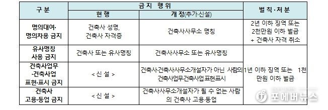 하지만 건축사사무소의 명의를 대여·차용하거나 건축사사무소 또는 이와 비슷한 명칭을 사용하는 행위, 비(非) 자격자의 건축사업무 또는 건축사업 표현·표시 및 건축사 고용·동업 행위 등에 대해서는 처벌 규정이 없어 건축 시장질서 혼란과 국민 피해가 지속되어 왔다.