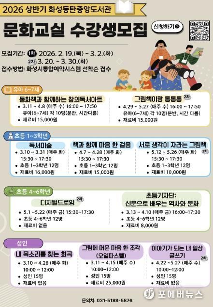 [ 포에버뉴스 김경순 기자 ] 화성특례시는 지난해 11월 3일 개관한 화성동탄중앙도서관에서 시민들이 다양한 독서·문화 활동을 즐길 수 있도록 2026년 상반기 문화교실 프로그램을 운영한다고 밝혔다.