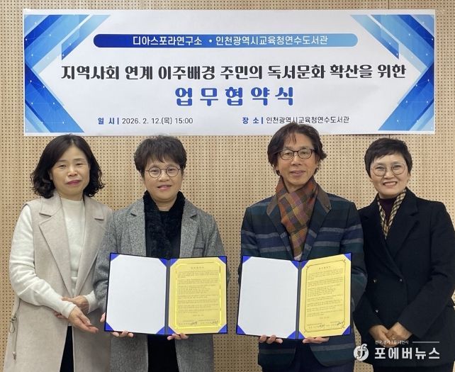 [ 포에버뉴스 김경순 기자 ] 인천광역시교육청연수도서관은 12일 디아스포라연구소(대표 이환회)와 ‘지역사회 이주민의 안정적 정착과 상호문화이해증진을 위한 업무협약’을 체결했다.