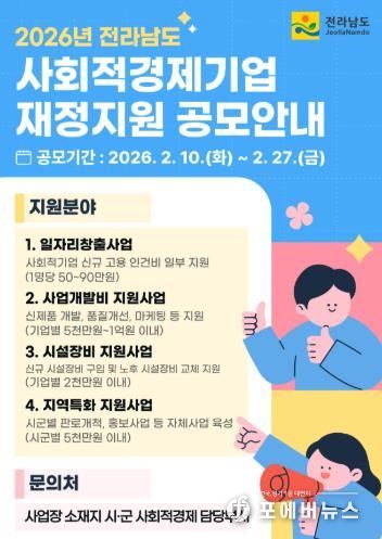 [ 포에버뉴스 오명숙 기자 ] 전라남도는 오는 27일까지 사회적경제기업의 지속적이고 안정적인 성장과 자립을 지원하기 위한 2026년 사회적경제기업 재정지원사업 공모를 추진한다.