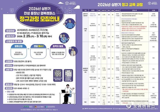 [ 포에버뉴스 김경순 기자 ] 안성 중장년 행복캠퍼스(한경국립대학교 평생교육원)는 2월 25일부터 3월 10일까지 ‘2026년 정규교육과정’ 수강생을 모집한다고 밝혔다.