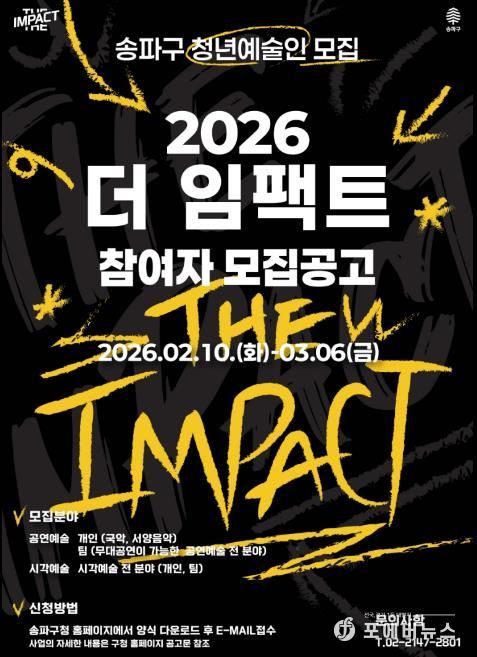 [ 포에버뉴스 김경순 기자 ] 서울 송파구는 재능 있는 청년예술인을 발굴·지원하는 ‘2026 더 임팩트’ 참가자를 오는 3월 6일 오후 5시까지 모집 중이라고 23일 밝혔다. 이번 공모는 지난 2월 10일부터 접수가 진행되고 있다.