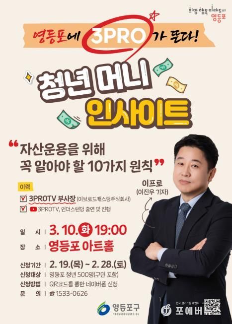 영등포구는 오는 3월 10일 영등포 아트홀에서 경제 명사 특강 ‘청년 머니 인사이트’를 개최하고, 청년 눈높이에 맞춘 자산운용 전략 10가지 원칙을 공유한다.