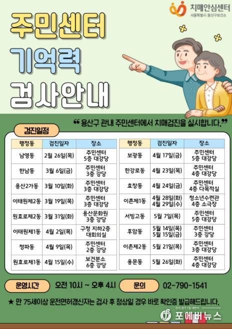 검사 대상은 치매 진단을 받지 않은 용산구 주민이며, 1인당 연 1회 무료로 참여할 수 있다.