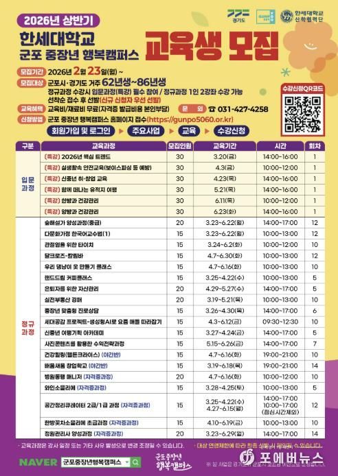[ 포에버뉴스 김경순 기자 ] 군포시가 인생 2막 설계와 사회참여 확대의 기회를 제공하고자 중장년 세대를 대상으로 2026년 상반기 중장년 행복캠퍼스 교육생을 모집한다고 밝혔다.