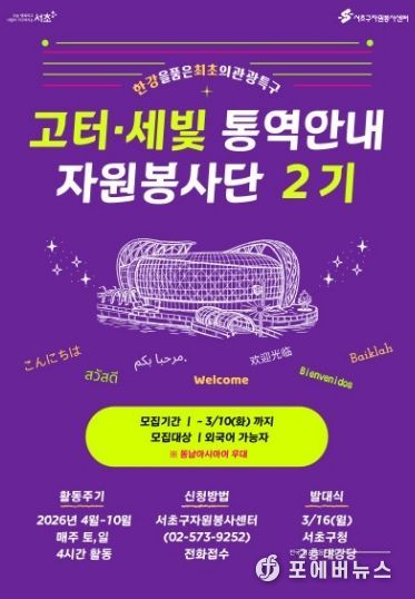 [ 포에버뉴스 김경순 기자 ] 서울 서초구가 오는 3월 10일까지 고터·세빛 관광특구에서 활동할 ‘통역안내 자원봉사단 2기’를 모집하며 글로벌 관광 거점으로서의 행보를 이어간다고 밝혔다.