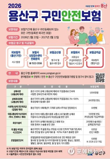 [ 포에버뉴스 김경순 기자 ] 서울 용산구가 2026년에도 전 구민을 대상으로 ’구민안전보험’을 확대 운영한다.