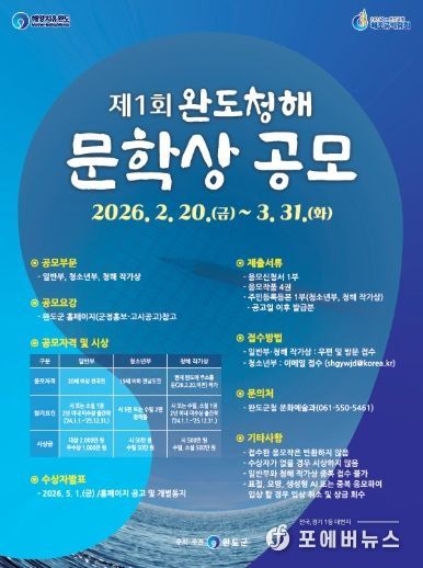 [ 포에버뉴스 오명숙 기자 ] ‘치유의 섬’ 완도군에서는 많은 사람들이 문학의 향기로 마음을 치유할 수 있도록 ‘제1회 완도 청해 문학상’ 공모전을 연다.