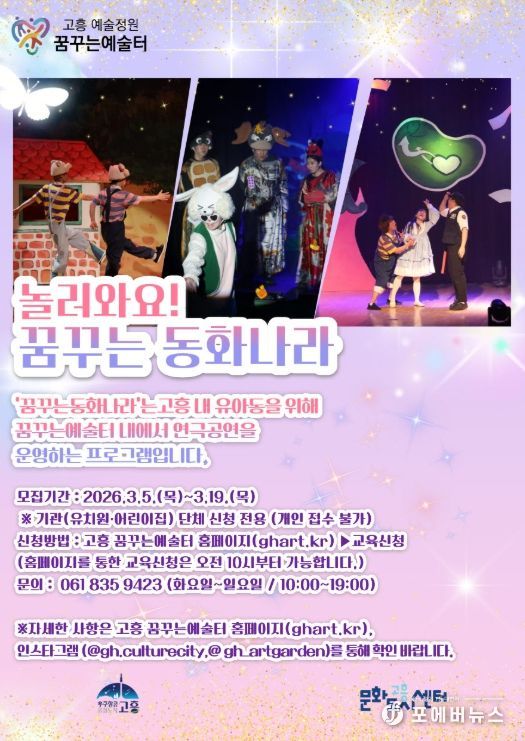 특히 이번 프로그램은 유치원과 어린이집 단위의 단체 관람으로만 운영되며, 개인 신청이나 개별 관람은 불가하다. 관람을 희망하는 관내 교육기관은 모집 기간 내 고흥 꿈꾸는예술터 홈페이지(ghart.kr)를 통해 신청하면 된다.