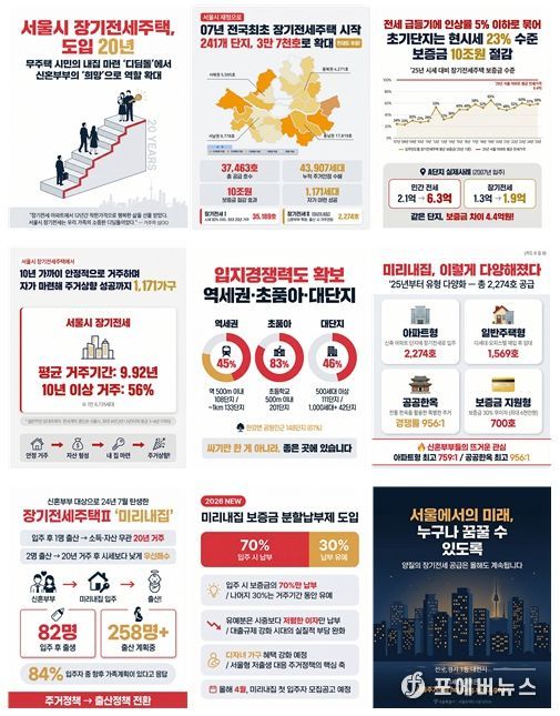 ‘장기전세주택’은 무주택 시민에게 장기간 안정적인 거주 환경을 제공하며 2007년부터 현재까지 241개 단지, 총 37,463호를 공급해 왔다. 지난 2024년에는 신혼부부에 특화된 ‘미리내집(장기전세주택Ⅱ)’을 새롭게 도입해 저출생 대응 주거정책으로 기능을 확대하고 있다. 현재 거주 중인 세대를 포함해 지금까지 총 43,907가구에 안정적인 주거를 제공했다.