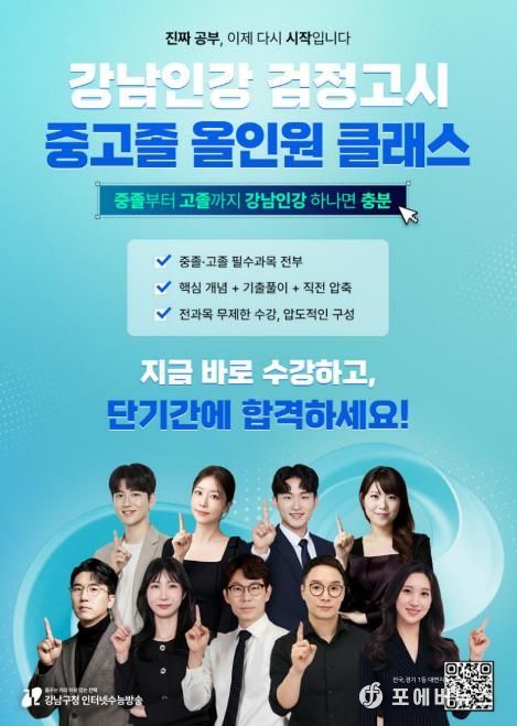 [ 포에버뉴스 김경순 기자 ] 꿈이 모이는 도시, 미래를 그리는 강남구가 검정고시 수험생을 위한 온라인 교육 콘텐츠 ‘강남인강 검정고시 올인원 클래스’를 개강한다. 고졸 과정은 3월 9일부터 강남인강 홈페이지에서 수강할 수 있다.