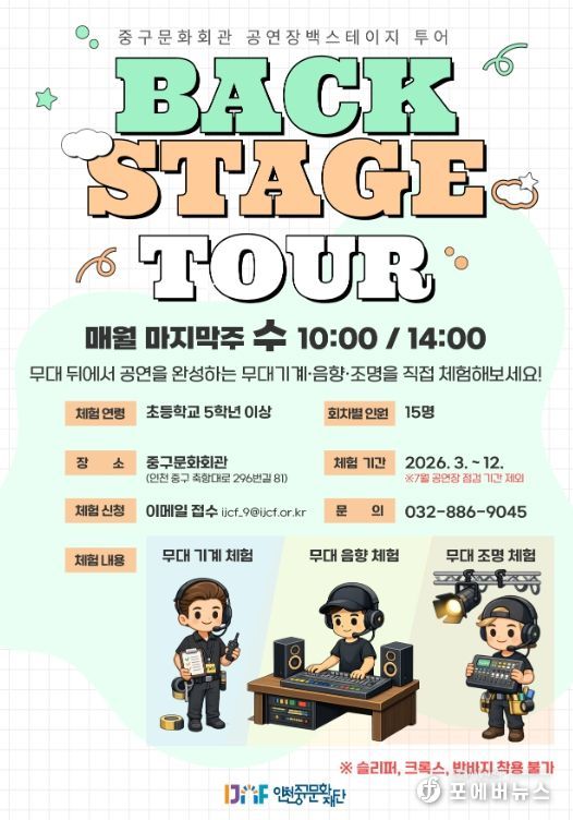 [ 포에버뉴스 김경순 기자 ] (재)인천중구문화재단은 시민들이 평소 접하기 어려운 공연장 무대 뒤 공간을 직접 체험할 수 있는 ‘2026년도 상반기 중구문화회관 백스테이지 투어’를 운영한다고 5일 밝혔다.