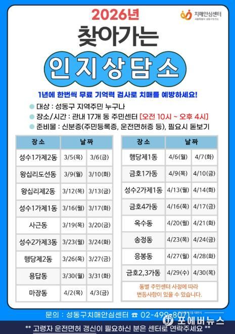 [ 포에버뉴스 김경순 기자 ] 서울 성동구 치매안심센터는 3월 5일부터 4월 30일까지 17개 동 주민센터를 순회하며 치매 조기 검진을 실시하는 ‘2026 찾아가는 인지상담소’를 운영한다고 밝혔다.