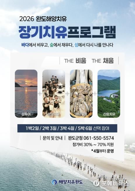 [ 포에버뉴스 오명숙 기자 ] 완도군에서는 4월부터 해양치유 활성화 및 효과 검증, 생활 인구를 확대하기 위해 ‘장기 체류형 해양치유 프로그램’을 운영한다.