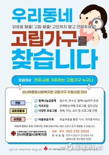 [ 포에버뉴스 이승훈 기자 ] 전주시 선너머종합사회복지관은 전주시에 거주하는 고립가구의 사회적 고립 해소와 지역사회 관계망 형성을 지원하기 위한 ‘2026년 고립가구 지원사업’ 참여자를 모집한다고 6일 밝혔다.