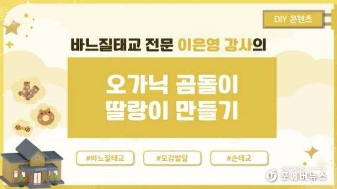 또한 3강은 엄마의 소근육 운동과 함께 아기의 두뇌 발달과 정서적 교감을 돕는 손수 제작(DIY) 손태교 교육으로 진행된다. 양평군보건소는 선착순 40명을 모집해 손수 제작(DIY) 바느질 태교 재료(곰돌이 딸랑이 만들기)를 자택으로 배송할 예정이며, 참여자는 동영상 강의를 보며 2주간 교육을 받을 수 있다.