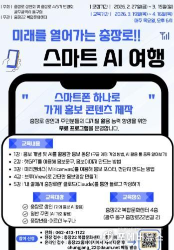 모집 기간은 15일까지이며, 충장로 상인(가게 홍보용 AI 활용을 원하는 상인), 일반 주민(AI 기초 활용 희망자), 중장년 및 어르신 등 관심 있는 누구나 신청할 수 있다.