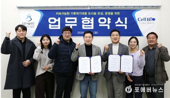 [ 포에버뉴스 김경순 기자 ] 인천시설공단 청라공원사업단이 지난 10일, 한국서부발전 사내벤처 ㈜셀바이오(대표이사 변형완)와 함께 업무협약을 체결하고 민관 협력을 통한 도시숲 조성과 공원 관리 효율화에 나선다.