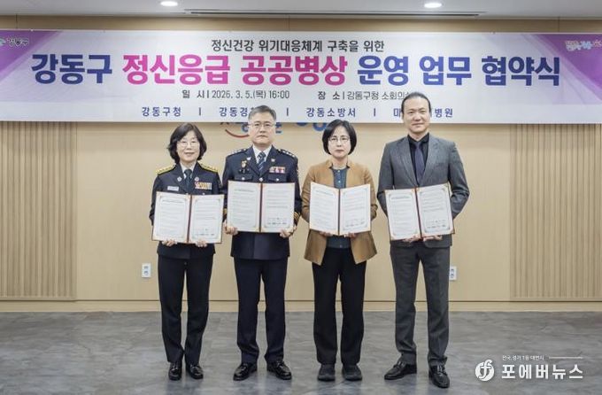 [ 포에버뉴스 김경순 기자 ] 서울 강동구는 지난 5일 구청에서 강동경찰서, 강동소방서, 마인드웰병원과 24시간 정신응급 공공병상 운영을 위한 업무협약을 체결하고 오는 15일부터 본격 운영한다고 밝혔다.