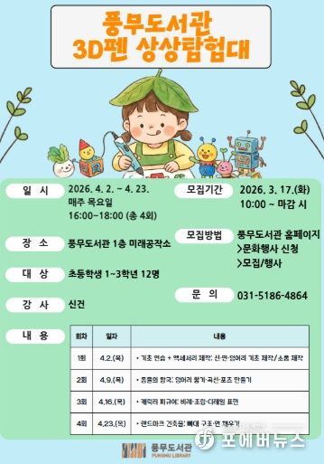 [ 포에버뉴스 김경순 기자 ] 김포시 풍무도서관은 초등학생 1~3학년을 대상으로 ‘3차원 펜 상상탐험대’를 오는 4월 2일부터 4월 23일까지 매주 목요일 오후 4시부터 6시까지 총 4회에 걸쳐 운영한다.