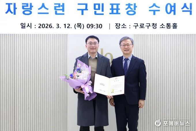 [ 포에버뉴스 김경순 기자 ] 구로구가 12일 구청 소통홀에서 구민의 생명 구조에 기여한 정귀현 씨에게 ‘자랑스러운 구민표창’을 수여했다.